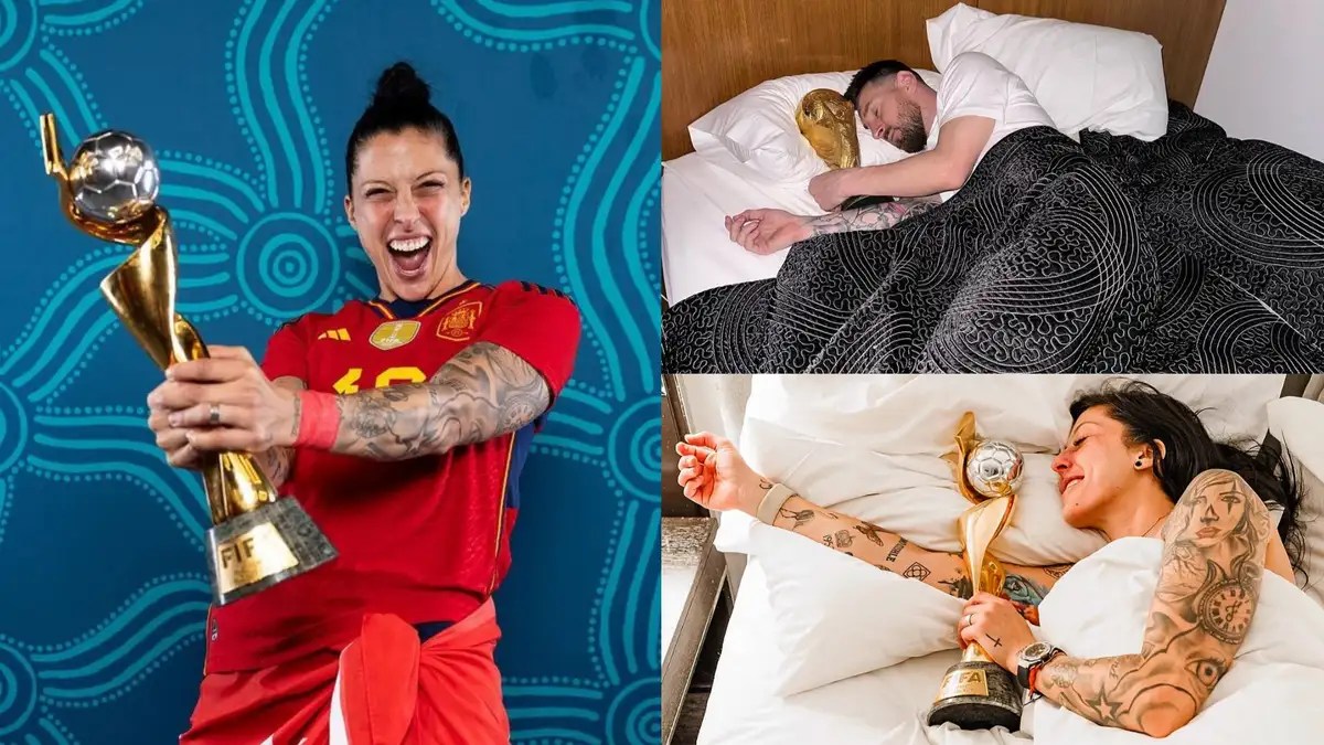 Spain’s Jenni Hermoso emulated Lionel Messi by posing in bed with the Women’s World Cup trophy.