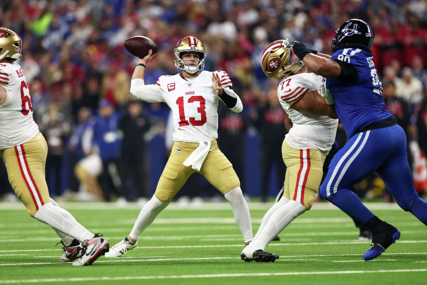Reflecting on the experience, Purdy expressed his excitement about the matchup against Rivers and the Colts, stating, “It was cool to be out here playing against Philip Rivers and the Colts. To go out and execute like we did, I’m really proud of these guys, everyone. Our defense, the turnover at the end of the game with Dee Winters, huge win for us.” With this impressive victory, the 49ers have positioned themselves as serious contenders as they head toward the playoffs, while the Colts must now navigate a challenging path in their quest for postseason qualification. The game not only served as a showcase for Purdy’s talent and growth as a quarterback but also marked a significant moment for the 49ers as they solidified their status as a dominant force in the league.