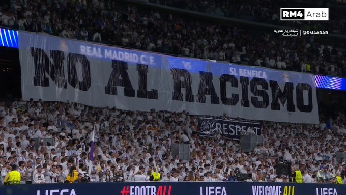 In the stands of the Bernabéu Stadium, fans expressed their condemnation of racism with visible support. Prominent among the displays was a large banner reading “NO AL RACISMO” (“No to Racism”), symbolizing a united stand against intolerance and hatred. This powerful message echoed throughout the stadium, not only reflecting the fans’ solidarity with Vinícius but also advocating for a broader cultural shift within football and society as a whole.